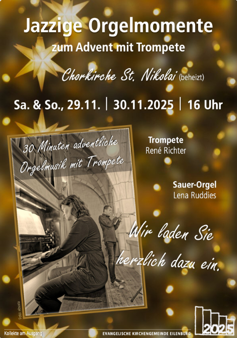 Am Sonnabend und am Sonntag, dem 29.11 und 30.11. lädt die Kirchengemeinde zu besonderen „Orgelmomenten“ um jeweils 16.00 Uhr in die Stadtkirche ein. Eine halbe Stunde erklingt adventliche und weihnachtliche Orgelmusik im Dialog zwischen dem Jazz-Trompeter Réne Richter und Lena Ruddies an der Sauer-Orgel. Am Ausgang wird eine Kollekte für die Kirchenmusik eingesammelt.
